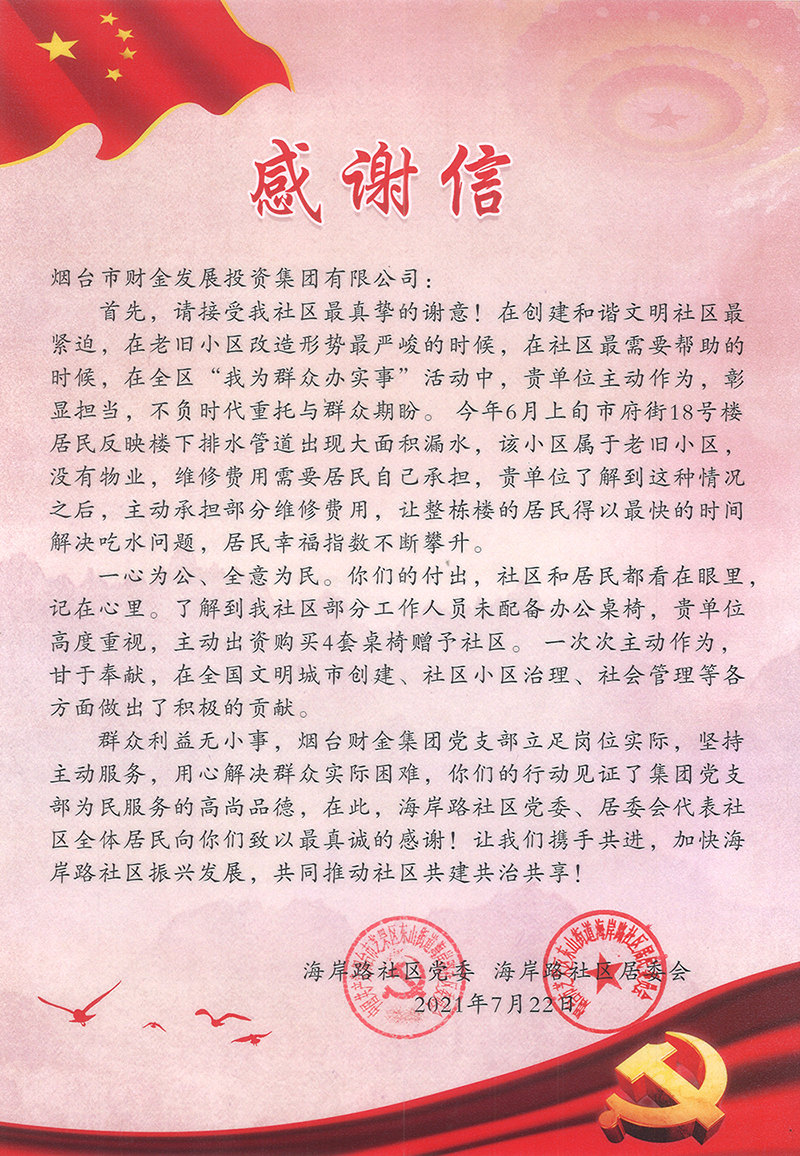 近日,集團收到了一封“雙報到”社區(qū)寄來的感謝信,東山街道海岸路社區(qū)黨委、居委會代表社區(qū)全體居民向集團黨支部在為民服務中主動擔當、積極作為致以真誠感謝。