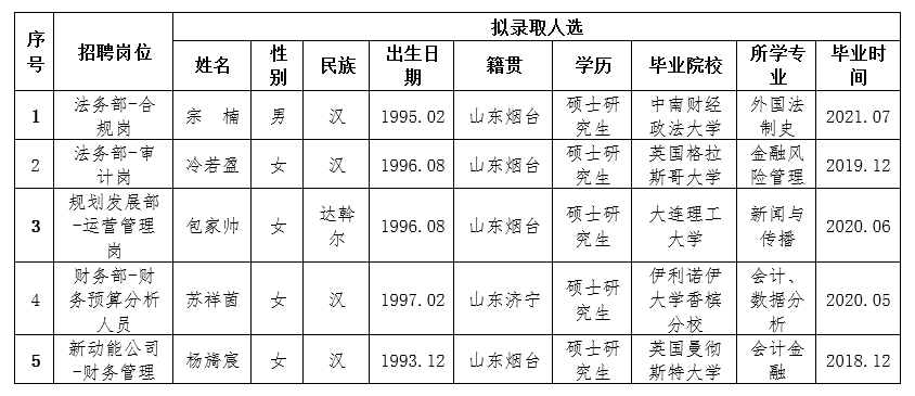 按照2020828日發(fā)布的《2020年煙臺(tái)財(cái)金集團(tuán)面向雙一流和全球TOP200高校畢業(yè)生公開招聘簡(jiǎn)章》相關(guān)規(guī)定,經(jīng)過(guò)簡(jiǎn)歷收集、資格審查、初試、復(fù)試、集體決策等環(huán)節(jié),擬確定部分崗位錄取人選(詳見下表),現(xiàn)予以公示,公示期為5個(gè)工作日(929日至1013日)。公示期間如有異議,請(qǐng)與煙臺(tái)市財(cái)金發(fā)展投資集團(tuán)有限公司聯(lián)系,電話:0535-6887256