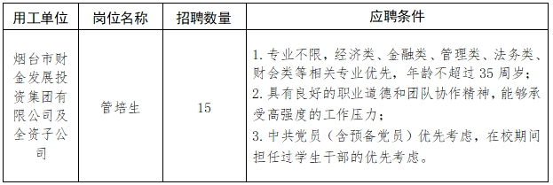 備注:市外首次來煙就業(yè)的35周歲以下(特別優(yōu)秀的年齡可適當放寬)非應(yīng)屆畢業(yè)生,如有應(yīng)聘意向,可先通過管培生崗位應(yīng)聘,如符合煙臺市人才引進政策,且順利通過集團招聘考核,將根據(jù)應(yīng)聘人員工作履歷情況,結(jié)合集團實際用工需求,主要分配到投資管理、融資租賃、保理、綜合文秘、運營管理等工作崗位。